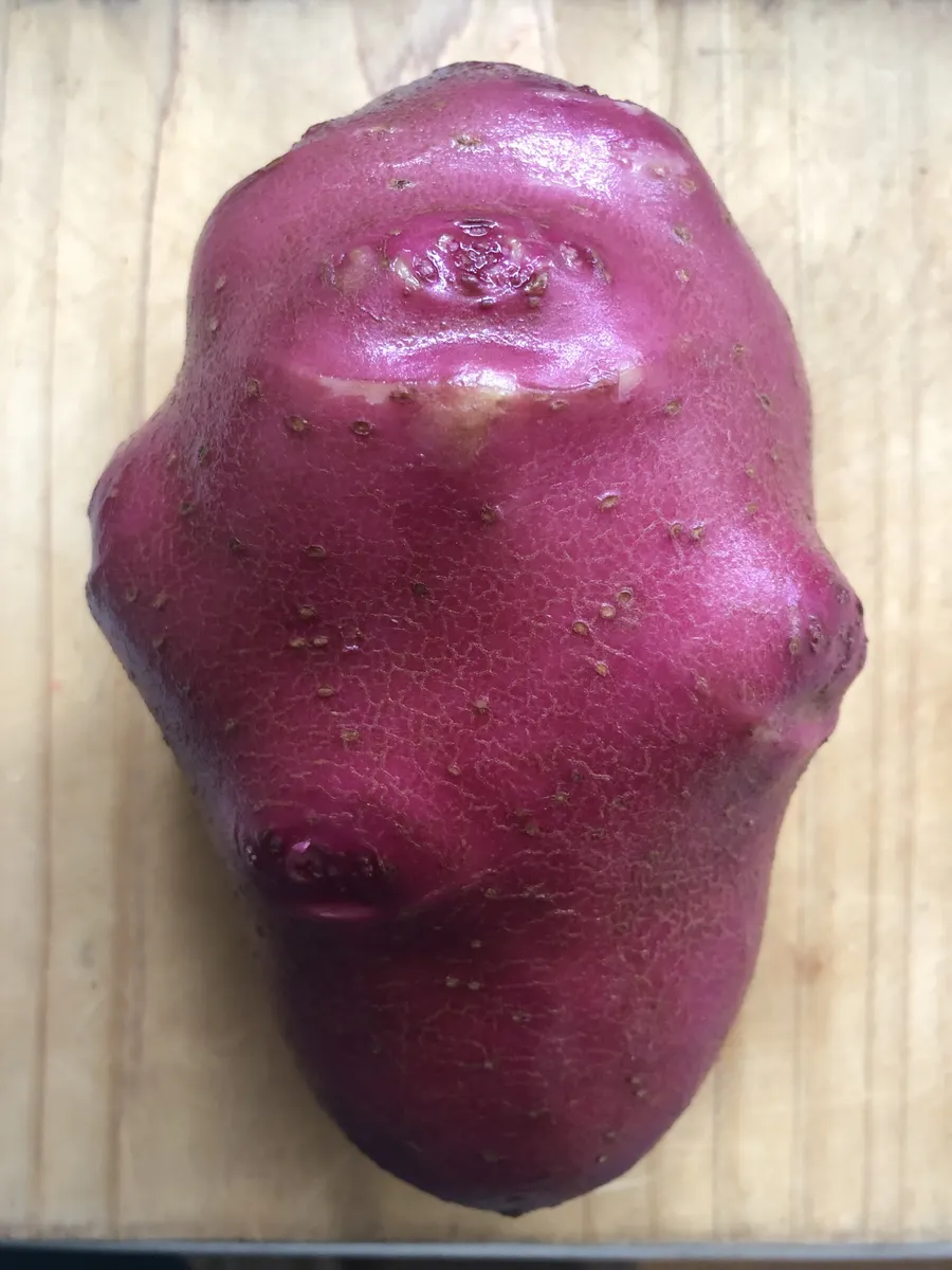たしかに外観はじゃがいもには珍しい赤色で、サツマイモや果物売り場で時折目にするドラゴンフルーツのようでもある。