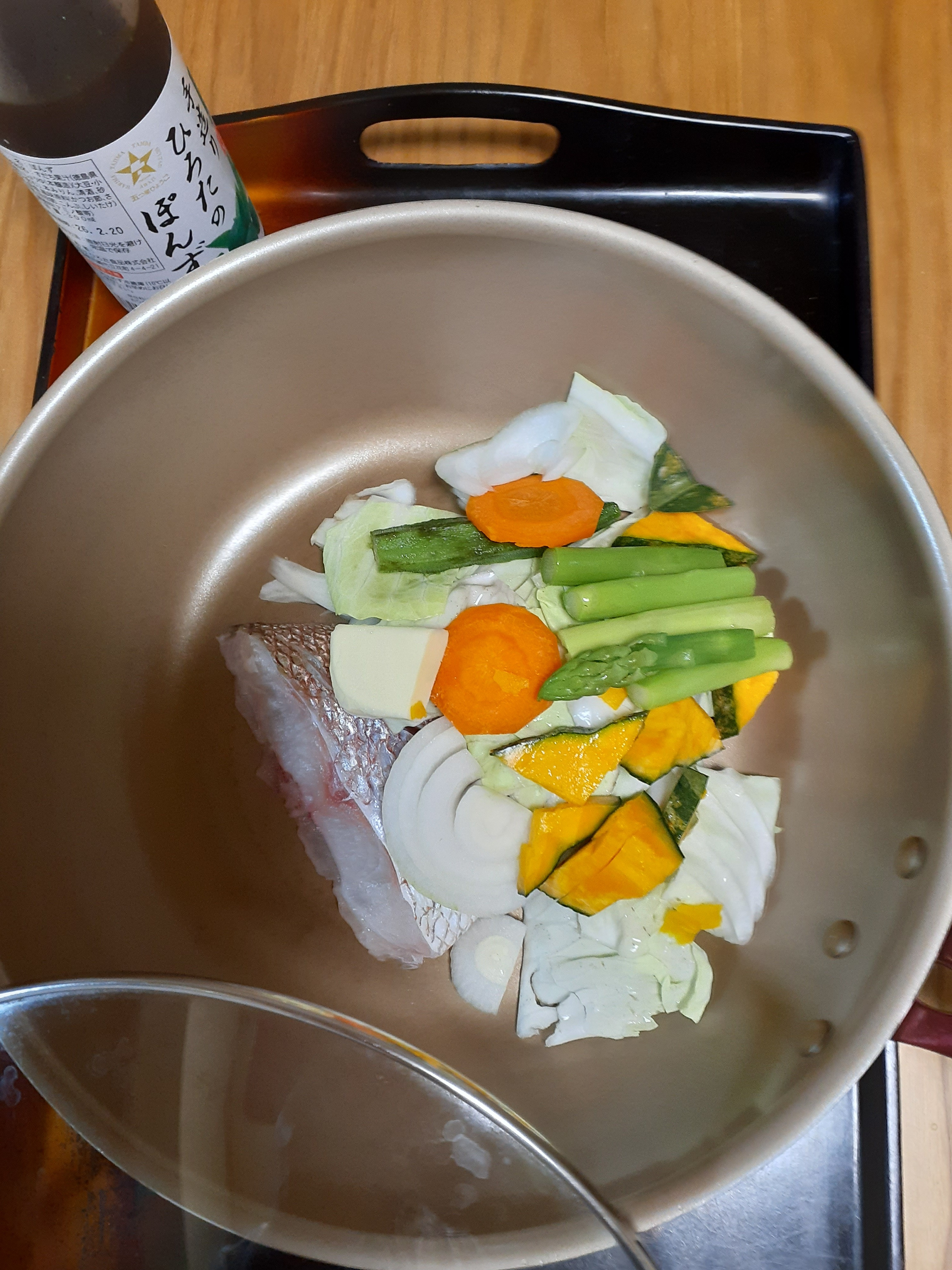 トップ > おやさい企画 > 調理が簡単 ほっこりーナ 2025/07/24 23:06 調理が簡単 塩をした鯛の切り身にキャベツ、玉ねぎ、人参、かぼちゃ、アスパラ、オクラを乗せて、少量の水と料理酒を入れ、フライパンの蓋をしてガスにかけるだけ。鯛に火が通ったらバターを乗せ、すだち果汁いっぱいのポン酢しょうゆでいただきます。 いいね コメントする 0 件の返信 (新着順)