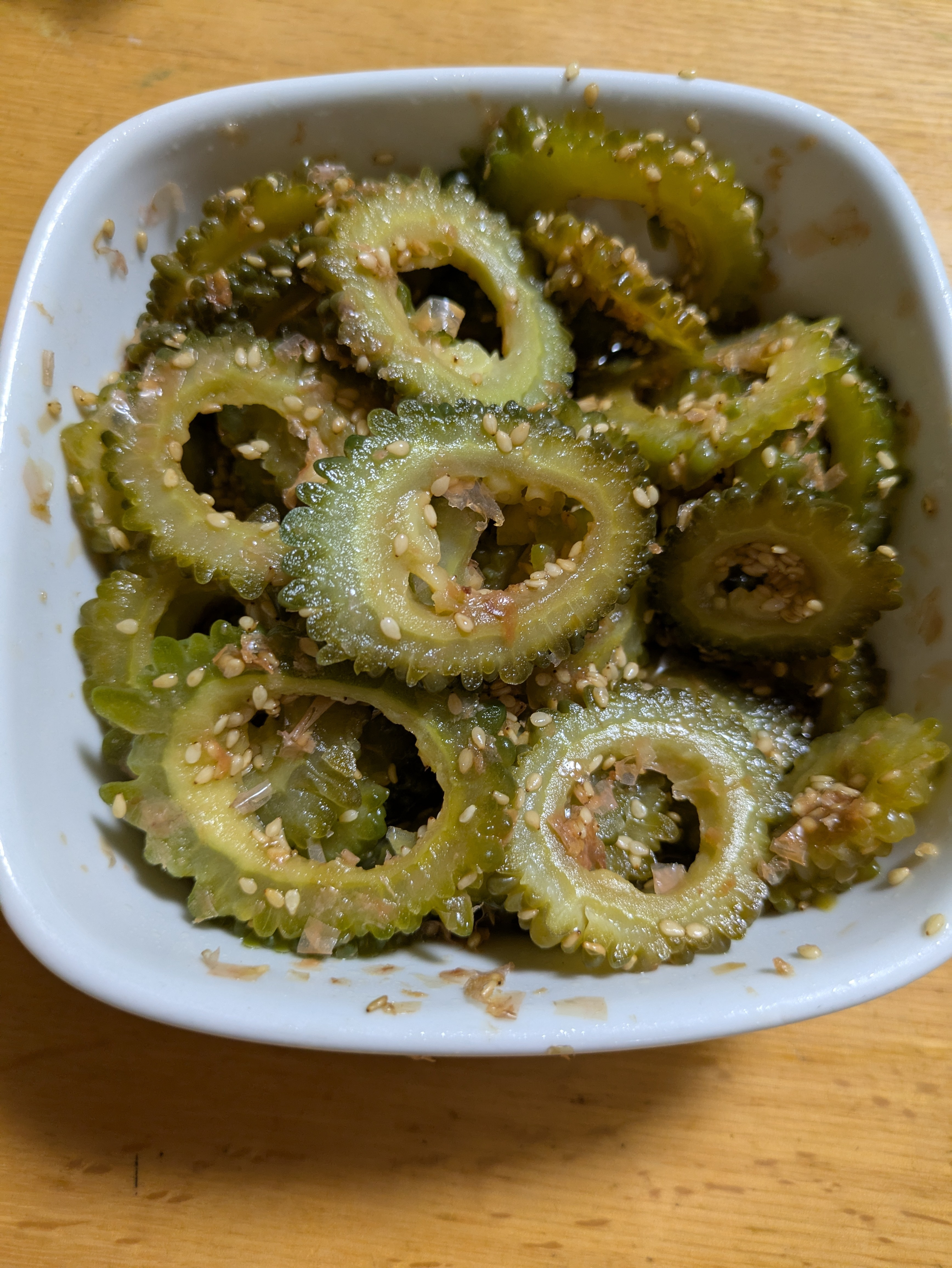 トップ > おやさい企画 > ゴーヤーの甘酢漬け えっちゃん 2025/09/26 06:41 ゴーヤーの甘酢漬け そろそろゴーヤーの収穫も終わりに近づいています 酢多め、胡麻油少々の甘酢漬けにしてみました いいね コメントする 2 件の返信 (新着順) ミュートしたユーザーの投稿です。 投稿を表示 ひこうき 2025/09/28 22:48 ごまたっぷりですね✨️ いいね 返信する ミュートしたユーザーの投稿です。 投稿を表示 あつこ 2025/09/28 15:20 生のまま苦くないでしょうか。 いいね 返信する ミュートしたユーザーの投稿です。 投稿を表示 えっちゃん 2025/09/29 07:06 あつこ 薄切りで水さらしてもよいですが、 これは熱湯で湯がいています だいぶ苦味は少なくなってます いいね 返信する