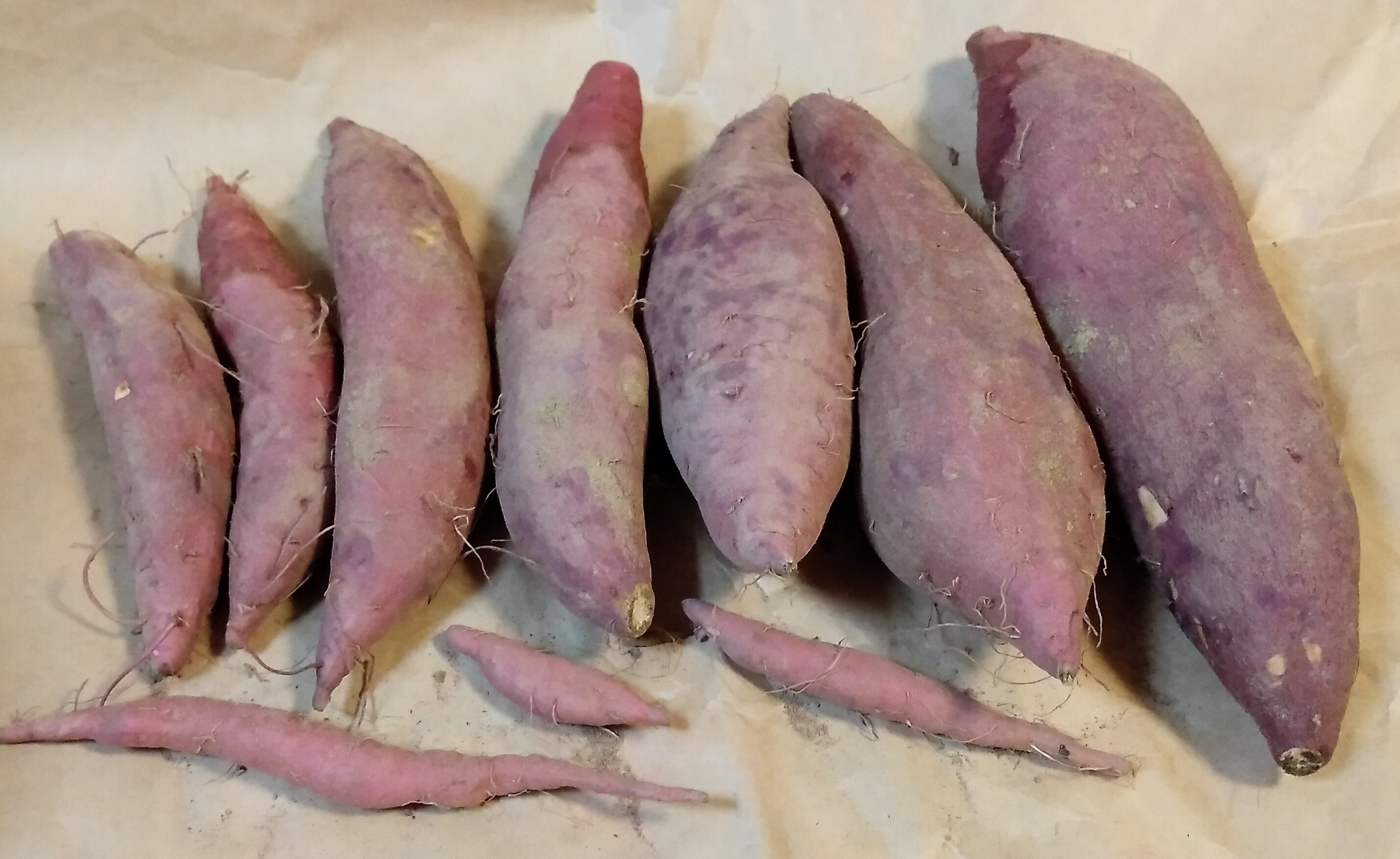 農園でサツマイモの収穫体験 二株づつが あまりにも少なかったらしく残ってるんちゃう?とスコップで掘り起こしてくださったけれど あら無いわって 芋ずる式に次々とというわけにはいかなかった(T_T)のでひとつおまけしてくださって(^_^; 小っちゃいのも(ちょっと筋っぽいかも知れないけど薄く切ってお味噌汁にしなさいと拾ってくれて) 隣の株や そういえば他の方々も ほとんど これより約2倍弱程も掘り当ててましたが、洗わずに数日置いておきなさいとのことで待機してます。