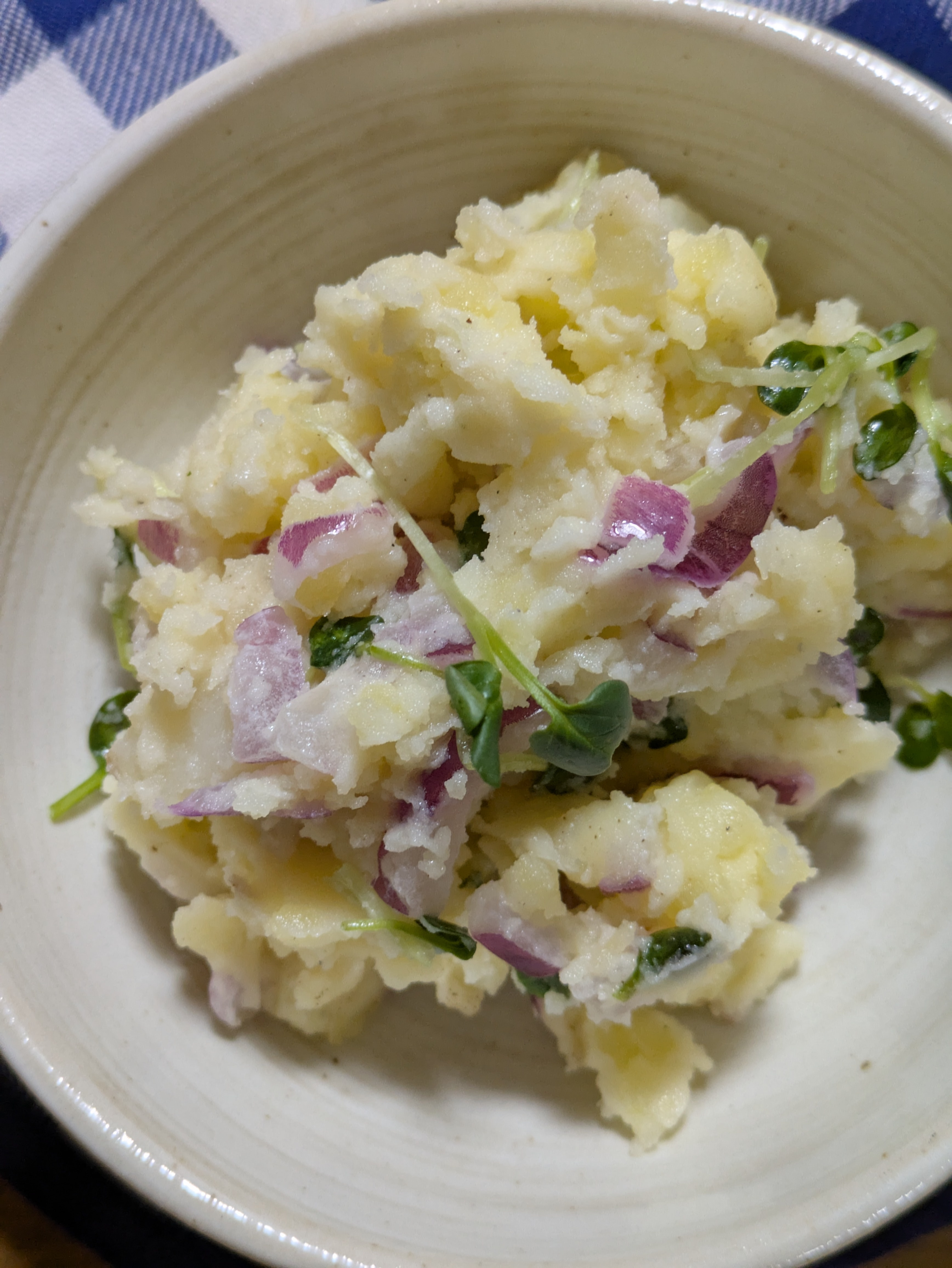 トップ > ポテサラ企画 > ポテサラ新発見 > キタアカリのポテトサラダ えっちゃん 2025/01/09 16:06 キタアカリのポテトサラダ 以前投稿したサラメシお弁当の中のポテサラに 貝割れ大根が入っていたのがピリッと美味しかったので ポテトサラダでアレンジしてみました。 キタアカリをゆでて熱いうちにつぶして オリーブオイルと米酢をまわしかけ、下味をつけます。 アーリーレッドはざっくり切って少し塩をしてしんなりさせました。 おいもが冷めたら貝割れと少量のマヨネーズを合わせます。 さっぱりしていながら味わい深いポテトサラダになりました。 バクバク食べられちゃいます(o^^o) プレゼントキャンペーン いいね コメントする 2 件の返信 (新着順) ミュートしたユーザーの投稿です。 投稿を表示 草取り名人 2025/01/10 07:03 とても美味しそうです。 いいね 返信する ミュートしたユーザーの投稿です。 投稿を表示 ほっこりーナ 2025/01/09 17:33 紫玉ねぎ、アクセントになってて、きれいですね。 いいね 返信する