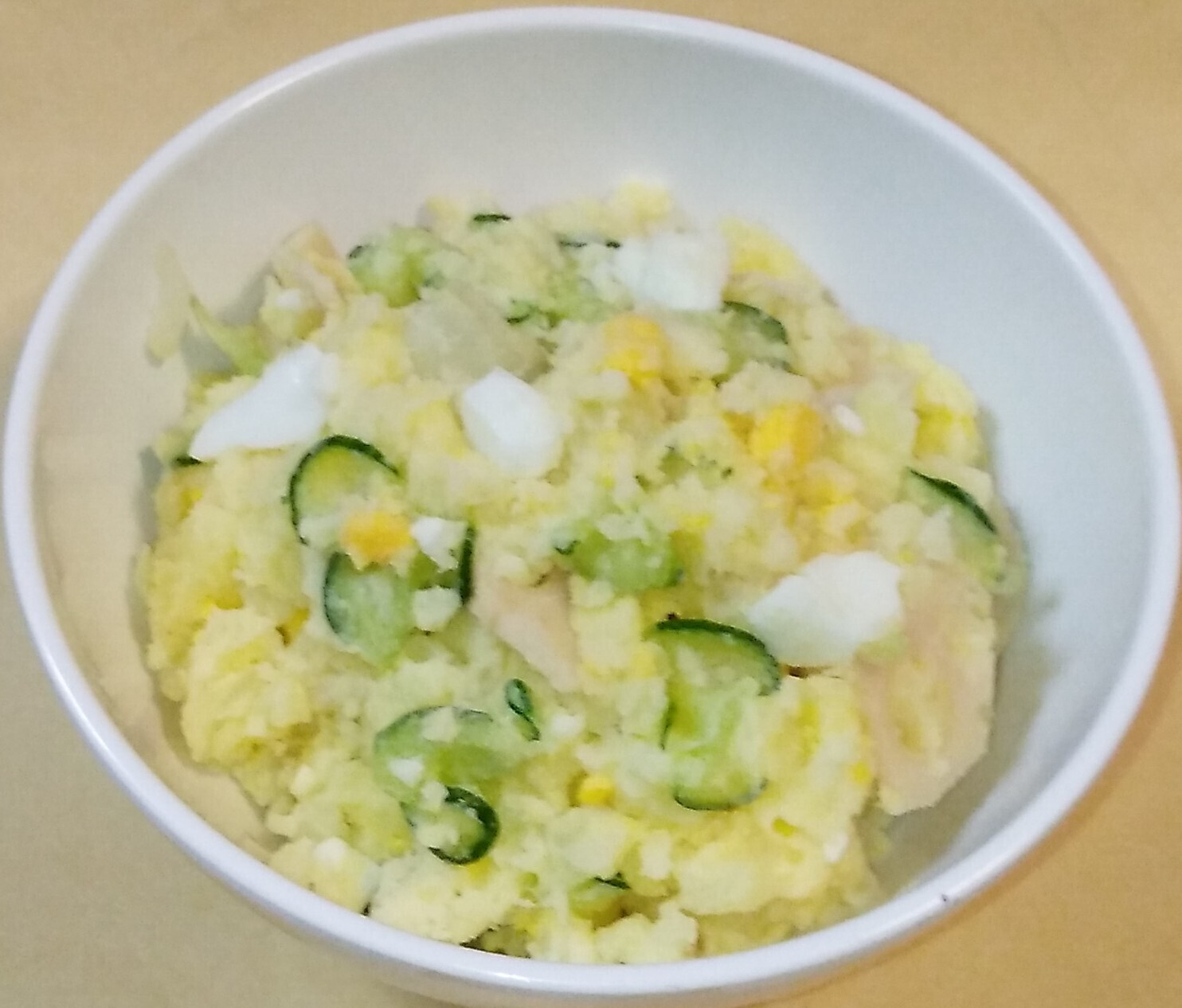 たまたま通りかかったお店で、大きなじゃが芋が、その中でも大小とりどり個売りになっているのを見つけ、重たいのでそのなかでも中位のを買ってみました。ペンと比べて見たけれど重さが分かった方が良かったかなぁと思ったら ちゃんと表示されてました(^_^; そいえばいままで大きなじゃが芋は中が茶色だったり空洞だったりと思いつつ 恐る恐る切ってみたら今回は大丈夫でした。1個分で十分小鍋いっぱいになり(さすがに丸ごとでは時間かかると思って 切って茹でました) 塩胡椒して ありあわせの胡瓜と酢蓮と新玉葱スライスと茹で玉子を定番のマヨネーズで和えてみました。