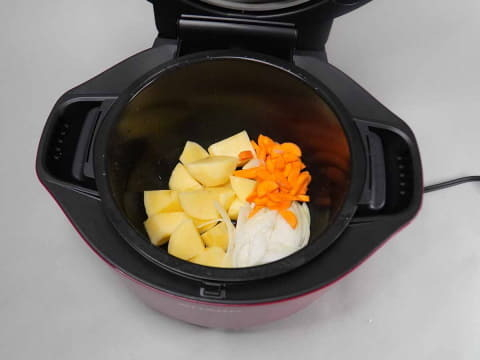 ①じゃがいもは洗ってかわごと4~6等分にカット。ホットクックに少量のお水とともに入れ、10分ほど加熱(我が家のホットクックだと「野菜ゆで」バージョンでやります。「蒸し」でもできます。)