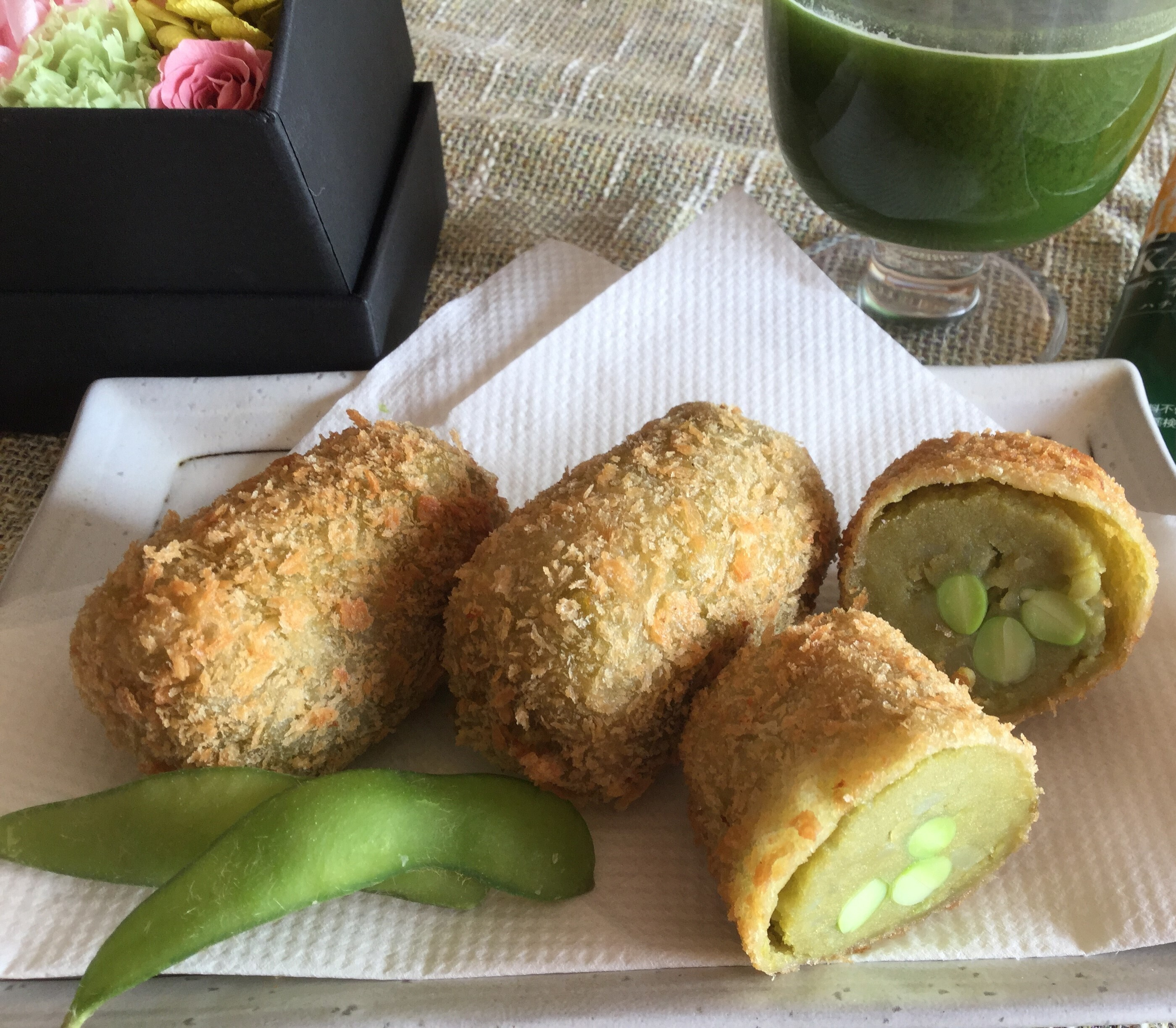 投稿を表示テーブルにあるものが気になりました。箱の中は、お花となんでしょうか。青汁のジュースも健康的です。