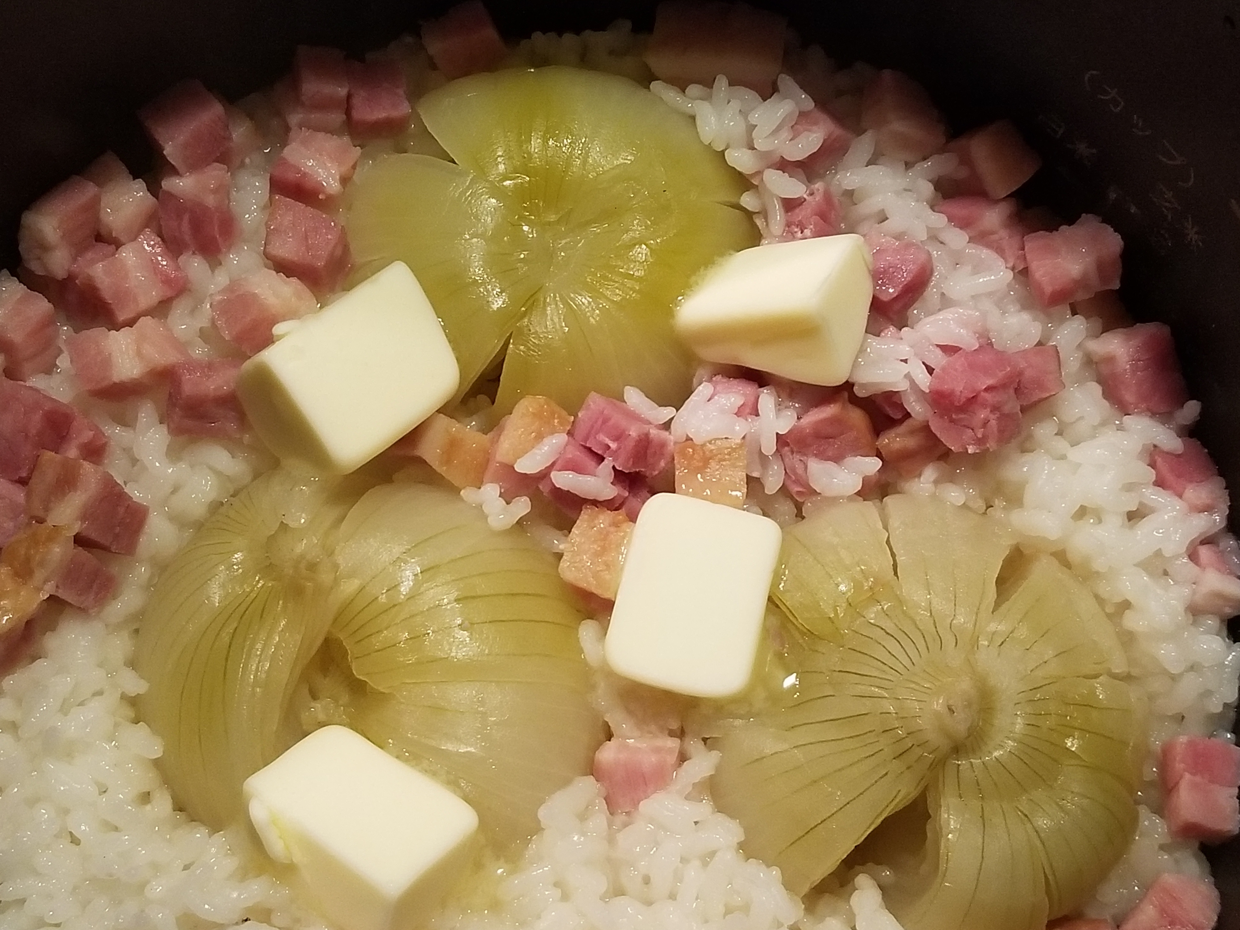 4、炊き上がったら玉葱の上にバターを置き、溶けたら全体を混ぜて完成