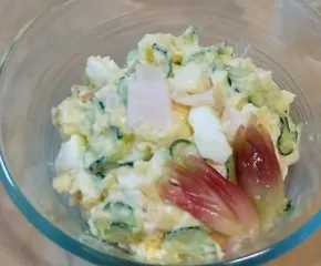 今回はじゃがいもさつまいも半々くらい うちにあるおいもの量次第で作ってます じゃがいもだけのポテサラより 甘みが増してなめらかなかんじの味です
