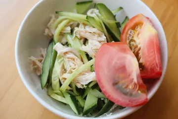 きゅうりと鶏ささみのサラダ さっぱりと、鶏ささみときゅうりにトマトを添えて。ダイエット中なので、ゴマだれで和えたいところを味ぽんにしてみました。