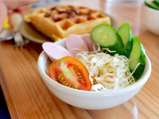 定番の小鉢サラダ 千切りキャベツと、家庭菜園で採れたトマトときゅうりに、タンパク質のおさかなソーセージも添えて。子供たちのパンやワッフルなどの付け合せとしてよく食卓に並ぶ、我が家の定番サラダです。