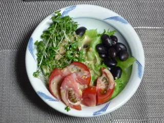今日の朝食サラダ 毎日、朝食に野菜サラダを食べています。家庭菜園で収穫したトマトはこのところ常連です。美味しいトマトなので大満足です。