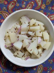 シャラダバタータ 初めて耳にした名前です。(ネットで検索しても見つかりませんでした) ワタナベマキさんのじゃがいも本からモロッコのポテトサラダを作ってみました。 じゃがいもは白ワインを加えてゆでて赤タマネギと合わせます。から煎りしたクミンシードとレモン汁、ナンプラー、オリーブオイルを加えて混ぜ合わ