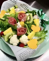 ブーケサラダ おもてなしの日はちょこっと小洒落たブーケサラダと、言ってもクッキングペーパーとリボンを用意するだけ(^。^)お好み野菜とフルーツ、生ハムをクルクルッと薔薇のように