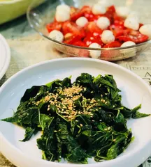 モロヘイヤのナムル風サラダ あまりネバネバぬるぬるした物が得意ではないのですが…身体を思って食しますナムルにすると、ごま油で食べやすいので定番です