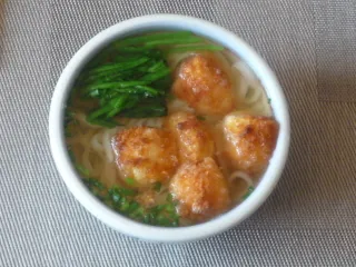 ポテトフライうどん ポテトフライを作りました。そして、温かいうどんにトッピングです。ポテトフライがうどんの汁をすって、格別な美味しさになってくれました。因みに、これは、学生時代に学食で食べたコロッケラーメンを応用したものです。