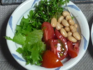 夕食の野菜サラダ 7月23日の夕食の野菜サラダです。トマトとアスパラガス、両方とも家庭菜園で収穫したものです。