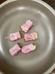 上手くいきませんでしたが ベーコンがあったのでポテトサラダを巻いて焼いて見ました。上手くできなかったですが色々と試して見るのは面白いです。