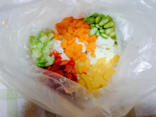 こんばんは。まあむさんのレシピ、とても素敵だと思いました。もみもみで作れるというのが、料理片付け苦手面倒派にとって有り難く、個人的に少しポテトサラダを作って見ることへのハードルが少し下がりました。またカラフルな見た目も良いですね。 ぽて三郎さんのコメントにも同意です。 揉む前の、にんじんなどの具は丁