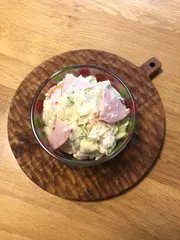 くるみ家本日のポテサラ☆ 《ハムオニオンマリネ からの進化ポテサラ》 前日のマリネの中にきゅうりの薄切り入れてしんなりさせておく じゃがいもレンチン→マッシュ冷ます マリネの汁気をきるじゃがいもとマヨネーズ和えるハムが少なくなっていたのでプラスしました 野菜の塩揉みいらない下味が付いて