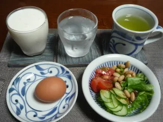 朝食の定番 1年365日、毎朝、同じメニューです。野菜サラダ、ゆで卵、そして飲むヨーグルトです。野菜サラダは、季節によって若干内容が変わりますが、毎日必ず食べています。
