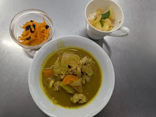 スパイスカレー 最近我が家はスパイスカレーブームです。 先日管理栄養士の方の講座でいろんなヒントをいただきました。ビタミンC補給にじゃがいもは是非!とのことでした。このスパイスカレーには仕上げに梅干しとお味噌が入ってます。梅干しはクエン酸、お味噌は発酵食品として、カレーの風味を損なうこと無くいろいろな栄養
