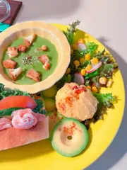 昨日のサラダワンプレート盛り お野菜11種類✨スナップエンドウがなくて、絹さやだけど。 スープの中のアボカド🥑以外、北海道産になりました😊
