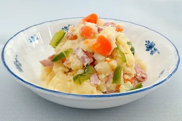 野菜たっぷりポテトサラダ 野菜たっぷりポテトサラダを作りました。ピーマン、にんじん、ピュアホワイトが入っています🌽ハーブとスパイスの効いたソーセージがアクセントになり美味しかったです😊