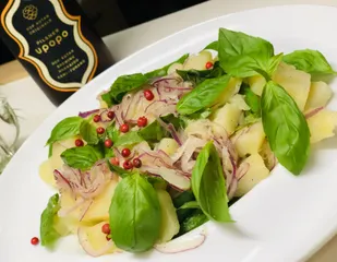 マヨ少なめバジルポテサラ フレッシュバジルを活かしてマヨ少なめポテサラアーリーレッドは友人の畑から。ピンクペッパーでアクセント