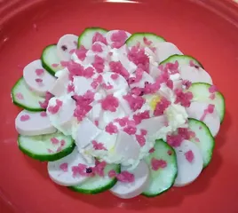 主役は魚肉ソーセージ! ポテサラに魚肉ソーセージをたっぷり混ぜて、新生姜の梅酢漬を散らしてみました(^_^; PS,予想外れで 胡瓜と太さがかなり違ってて元々センスが無いのも手伝って中々見栄え良くいきません(+_+)