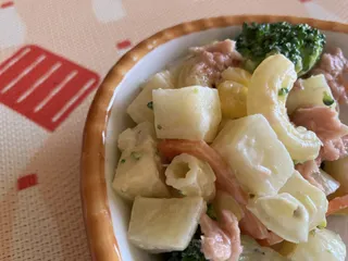 マカロニサラダからポテサラに 前日に作ったマカロニサラダが一人分しかなかったので、サイコロに切ったじゃがいもをササッと茹でて嵩増しして、ポテサラにしてしれっと出しました。残り物だとバレないよう、存在感のあるシーチキンで気を惹きました。