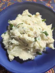 ツナいもサラダわさび風味 なぜか「ツナポテトサラダ」ではなく「ツナいもサラダ」とよんでいます。 材料はおいもとツナ缶と青ネギです。おいもの下味に今日は胡麻ドレッシングを少々。(なくてもOK)味付けはわさびとマヨネーズ(量は適当、味をみながら) お魚だからわさびを使ってみたのかなあ。はじめて作ったのはだいぶ