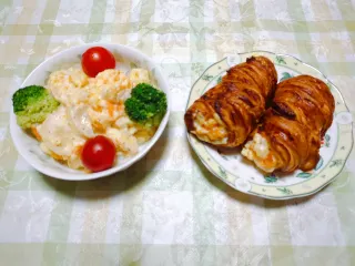 自家製パンに詰めてみました(^o^)v ホントはクリームコロネになるはずだった失敗作に玉ねぎたっぷり、パルメザンチーズ入りポテサラを詰めてみました。