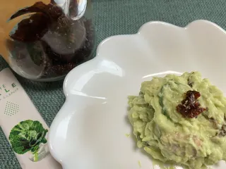 青汁の粉末を入れて さわやかな緑色のポテサラを作ってみました。トッピングはドライトマトです。