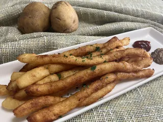 ロングフライドポテト レンチンしたじゃがいも(200g)をつぶして片栗粉(50g)を加えてなめらかになるまで練り、塩こしょうで味を調え、ジップロックなどの袋に1cmの厚さに伸ばします。冷蔵庫で1時間ねかせると扱いやすくなります。袋の端を切り離して広げ、1cm幅の棒状に切り油で揚げます。まわりカリカリ、中はモチモチのフライ