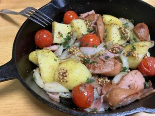 スキレットで粒マスタード焼き スキレットに家庭菜園で採れたミニトマト、玉ねぎ、パセリ、レンチンしたじゃがいもを並べて焼きました。粒マスタードの香りが飛ばないよう、仕上げにトッピングしました。