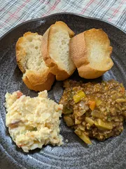 ドライカレーとポテトサラダ 1月22日は「カレーの日」だったので、ドライカレーを作りました。 普通のカレーはごろっとじゃがいもですがドライのときは少し小さめにします。 前の日に作ったポテトサラダと盛り合わせてそれぞれの味の違いを楽しんだり混ぜ合わせて新しい味にしたり ポテトサラダもカレーもいろんな