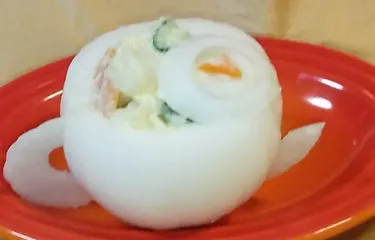 新玉ポット(^_^; 新玉葱ならではの器にしちゃいました。ティーポット風 に遊んじゃいましたが、さすがにお箸では食べ難くナイフとフォーク緊急お呼び出しで~す(;^_^A
