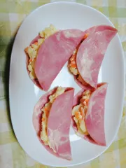 高級ハムに包まれて ホントにホントに久しぶりの投稿です。(サボりすぎですね。写真はいっぱいたまってるけど(;´∀`))。普段は3pか4pのロースハムしか買わないけど。めったに買わないホワイトロースハム…刻んでポテサラに混ぜ込むには忍びなく、人参、玉ねぎ、粉チーズ入りポテサラを包んでみました。