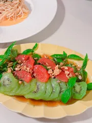 今夜は緑のバジルで 緑のバジルを20枚くらい千切って、グレープフルーツと共にビネガーマリネしました。さっぱりサラダ🥗