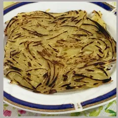 ハッシュポテト じゃがいも2個を細切りにするフライパンにバターを入れてじゃがいもを押し付けてくっつける。塩コショウをふって頂く。