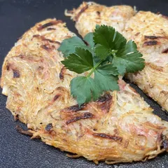 じゃがいものガレットを作りました。 じゃがいもをスライサーで千切り水にさらさずに切ったまんま小麦粉とハムの千切りを入れて塩コショウ、ホットプレートで焼きあげました。 カリッとがまたごちそう。 簡単にできるので気に入っています。 さらさないのはでんぷん質を取ってしまうのでまんまです。