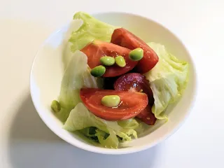 産直レタスと広島産の枝豆でサラダ🥗 大阪の四條畷のイオンの産直で買ったレタスがとても美味しくて広島産の枝豆を買ったら中からとても綺麗な色の豆が出てきてトマトは地場の京都のトマト色々な場所のコラボで美味しいサラダが出来ました😋