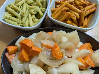 丸鶏でローストチキン 焼くときに天板のスキマにいろんな野菜をぎっしりのせます鶏の脂が染み込んだ美味しい一品じゃがいもサイコーです! ペンネはバジルとアラビアータ緑と赤のクリスマスカラーです🎄