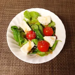 チーズとトマトのサラダ チーズが食べたい気分だったのでサラダにのせてみました。野菜の上にミニトマトとカマンベールチーズをのせて、粉チーズと玉ねぎドレッシングをかけました。