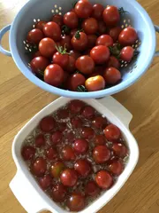 ミニトマトが大量です! 庭で採れすぎミニトマト ミニトマトにフォークで穴をあけて玉ねぎのみじん切りとガーリックドレッシングでマリネにしました