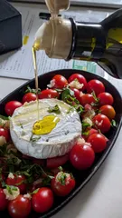 プチトマトのチーズ焼き 自家栽培のプチトマト。一斉に成るから慌てちゃいますね(笑) そんなプチトマトを鉄板に並べて、北海道産チーズを真ん中に置いて、オリーブオイルを注いで、オーブンでじっくり焼いたら・・・濃くて美味しいトマトソースが出来ました💖酸味と塩味のマリアージュ。何に和えても美味しいです✨