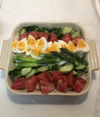 千切りキャベツの上に きゅうりトマト茹で卵アスパラ 乗せただけのサラダ☺️